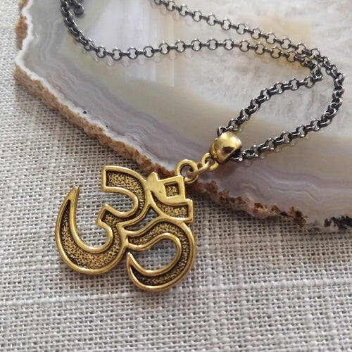 Ohm Aum Necklace - Brass Charm on Gunmetal Rolo Chain - Reiki Zen Yoga Jewelry