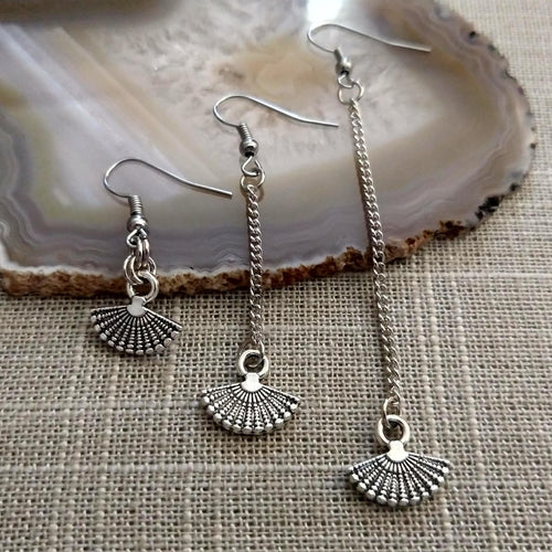 Silver Tiny Fan Earrings, Your Choice of Three Lengths, Long Dangle Chain Drop