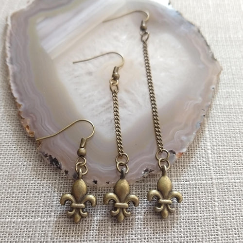 Fleur de Lis Earrings, Dangle Drop Chain Earrings in Your Choice of Three Lengths