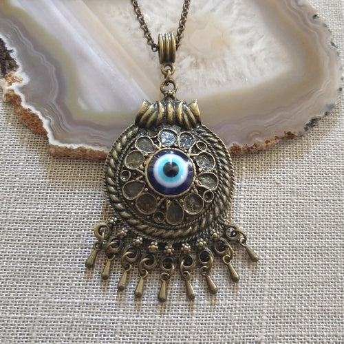 Evil Eye Medallion Necklace - Blue Protection Pendant on Bronze Rolo Chain
