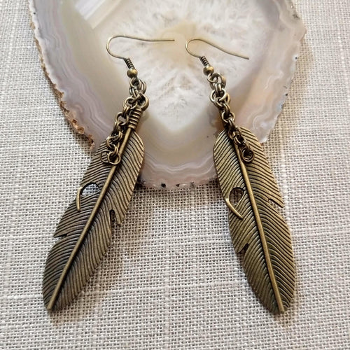 Feather Earrings, Long Dangle Drop Earrings with Bronze French Earwires