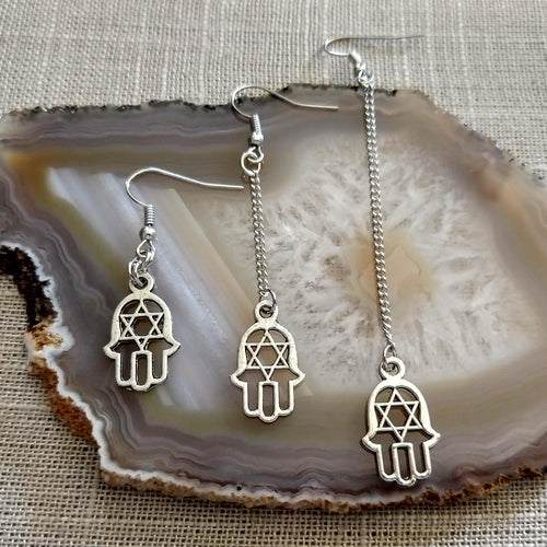 Hamsa Earrings, Star Of David Jewelry, Your Choice of Three Lengths - Long Dangle Chain Earrings